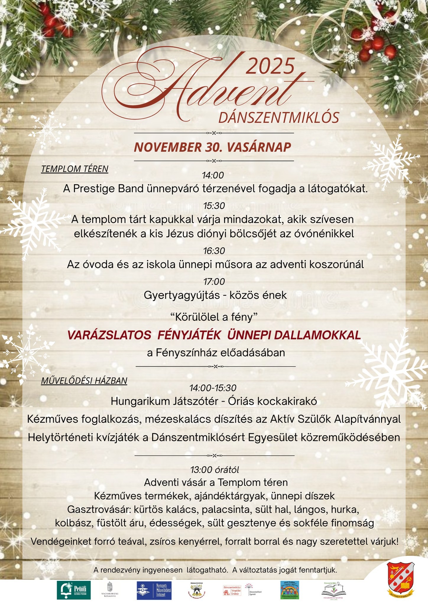 Dánszentmiklós idén is szeretettel várja a lakosságot és a vendégeket a 2025. november 30-án, vasárnap megrendezett ünnepi adventi programokra. A település már az első gyertya meggyújtásával közösen hangolódik a karácsonyra, zenével, kézműves foglalkozásokkal, vásárral és különleges fényjátékkal.