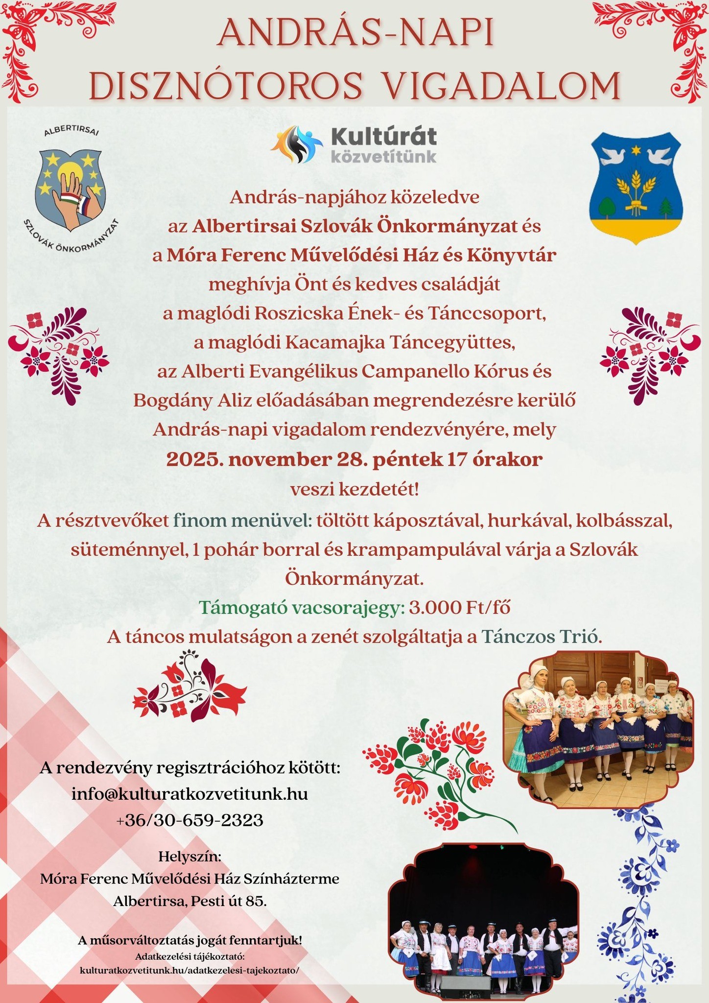 András-napjához közeledve szeretettel hívunk és várunk mindenkit a maglódi Roszicska Ének- és Tánccsoport, a maglódi Kacamajka Táncegyüttes, az Alberti Evangélikus Campanello Kórus és Bogdány Aliz előadásában megrendezésre kerülő András-napi Disznótoros Vigadalom rendezvényére, mely