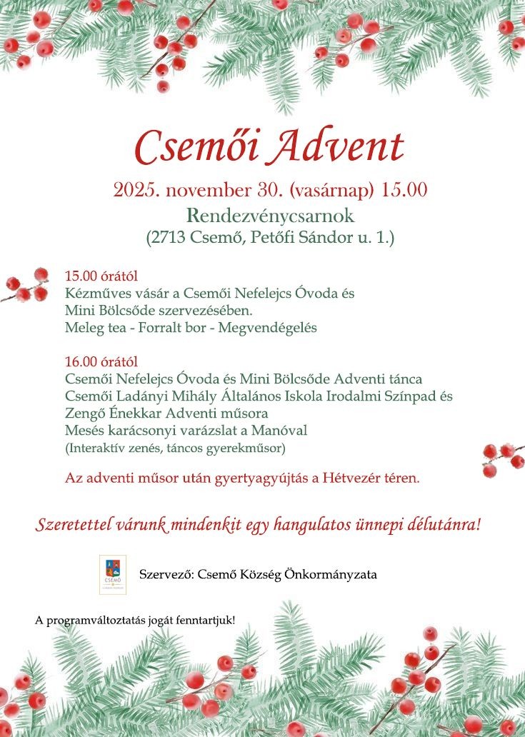 Csemő község meghitt adventi délutánra invitálja a lakosságot 2025. november 30-án, vasárnap 15 órától a Rendezvénycsarnokba.