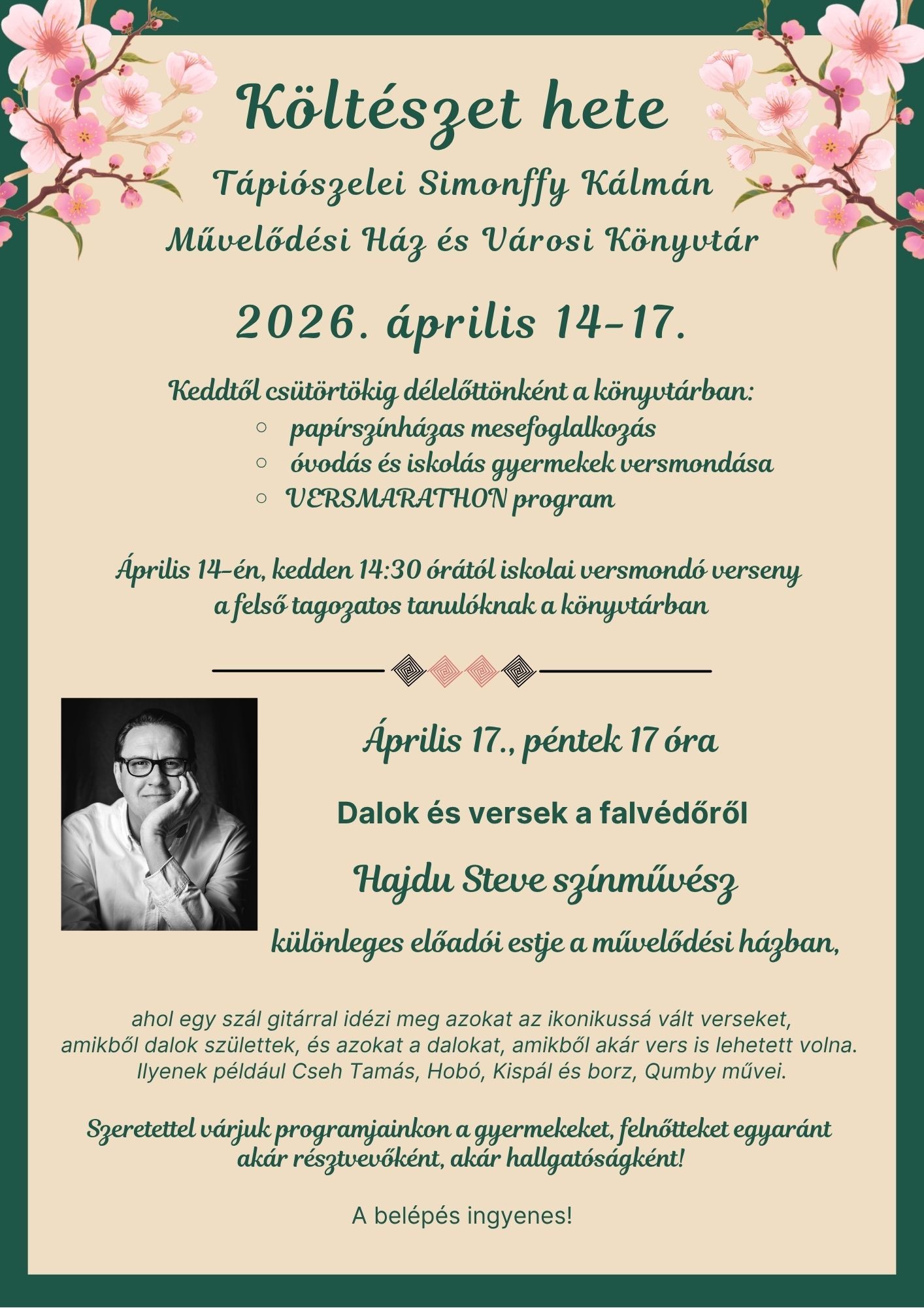 A Simonffy Kálmán Művelődési Ház és Városi Könyvtár sok szeretettel vár minden kedves érdeklődőt a Költészet Hete rendezvényein! Az egész héten át tartó programsorozat keddtől csütörtökig a könyvtár falai között biztosít élményekkel teli programokat, pénteken pedig a művelődési ház színpadán zárjuk az egész hetes eseménysorozatot, Hajdu Steve önálló zenés - verses előadásával! Ugye Te is ott leszel?