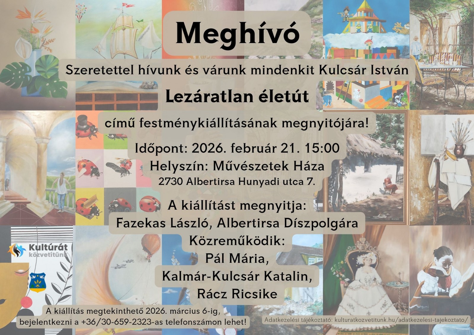 Szeretettel hívunk és várunk minden érdeklődőt Kulcsár István: Lezáratlan életút című festmény kiállításának megnyitójára!